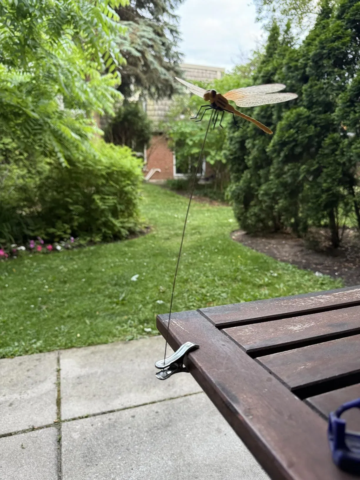“This product is simple but surprisingly well made. The dragonfly design is detailed and the wings catch the light nicely, making it look almost real from a distance. I used it in my backyard near some plants and it blends in perfectly with the outdoor environment. The metal rod is long enough to position it wherever you want, and the clip holds securely. On top of that, the shipping was very fast. I ordered it and it arrived in just a few days, which was a great experience. For the price, I thin”